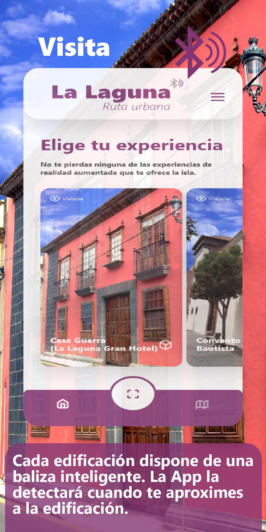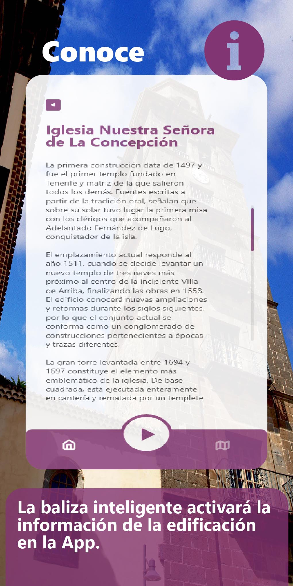 Utilizando geolocalización y balizas de audio se diseño una APP que creó una ruta por las principales (28) edificaciones históricas de La Laguna . El usuario al encontrase en la coordenada del lugar se activaba un audio con una reseña histórica del lugar. Estuve a cargo del diseño gráfico de esta APP para el Ayuntamiento de La Laguna.